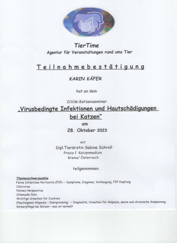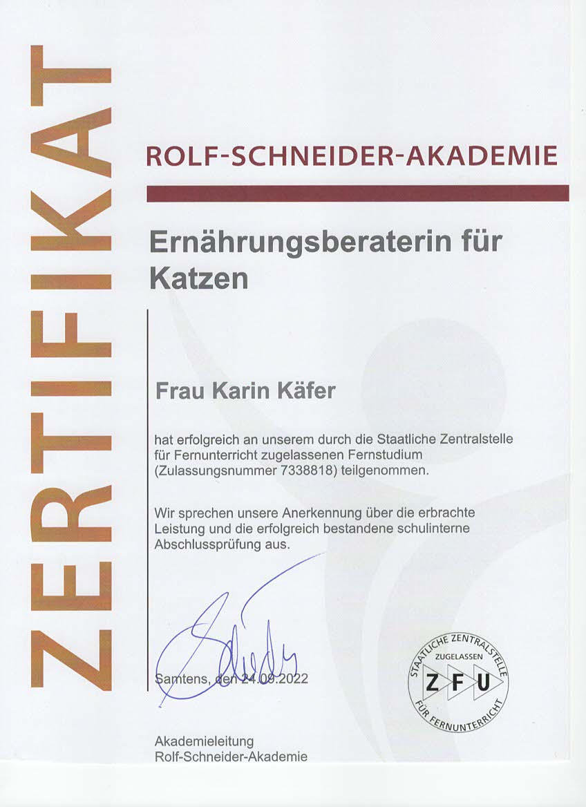 In Bezug auf meine Tätigkeit als Ernährungsberaterin für Katzen bilde ich mich stets weiter, um immer auf dem neusten Stand zu sein. Die meisten Dosenöffner, die zur Beratung kommen, kümmern sich daheim - wie ich selbst - liebevoll um eine kranke Katze oder einen erkrankten Kater. Deswegen war der erste Schritt: das Fernstudium mit dem Abschluss "Ernährungsberaterin für Katzen".