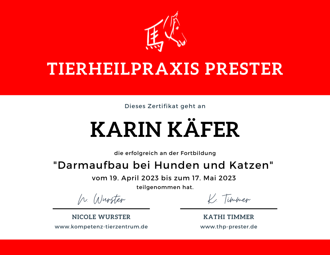Doch auch meine anderen vierbeinigen Freunde sollen bestens versorgt sein. Deswegen plane ich zukünftig, an weiteren Fortbildungen teilzunehmen. Meiner Verantwortung bin ich mir bewusst und gerade deswegen ist es mir wichtig, in kritischen Situationen die richtige Entscheidung zu treffen. Hier finden Sie zu jeder Zeit den aktuellen Stand meiner Haustier-Weiterbildungen.